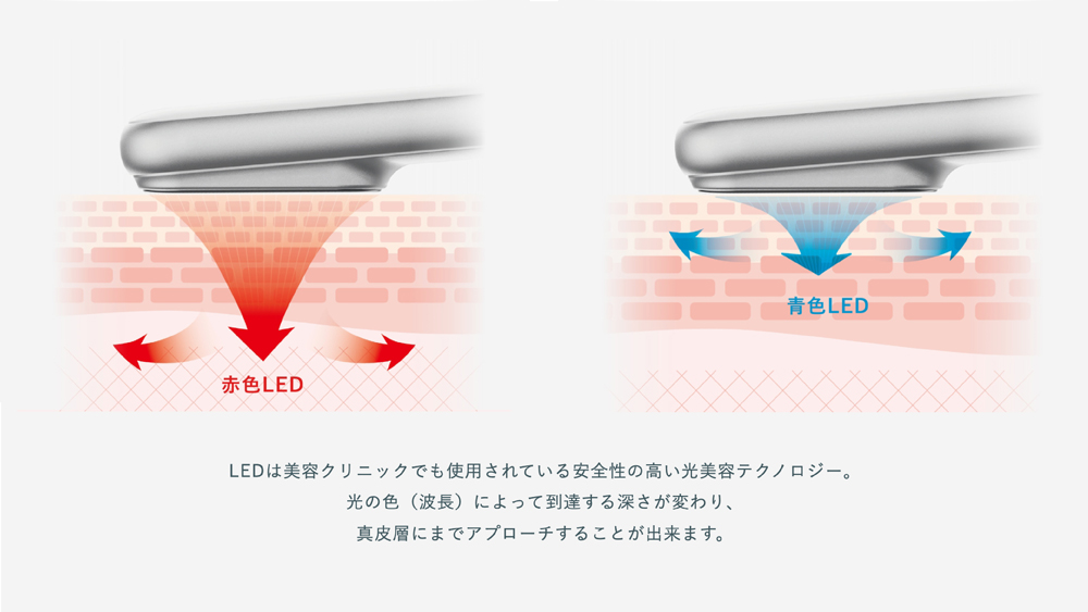美容クリニックでも使用されている安全性の高い光美容テクノロジーであるLEDを搭載 。光の色(波長)によって到達する深さが変わり、肌の真皮層にまでアプローチすることが可能です 。