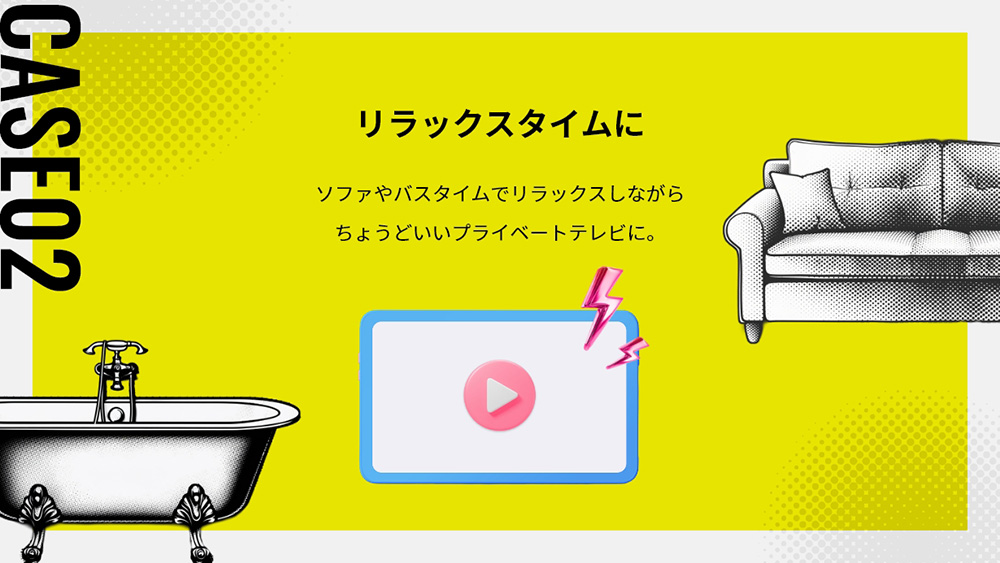 ソファやバスタイムでリラックスしながら。防水端末を使えば、お風呂がちょうどいいプライベートテレビ空間になります。